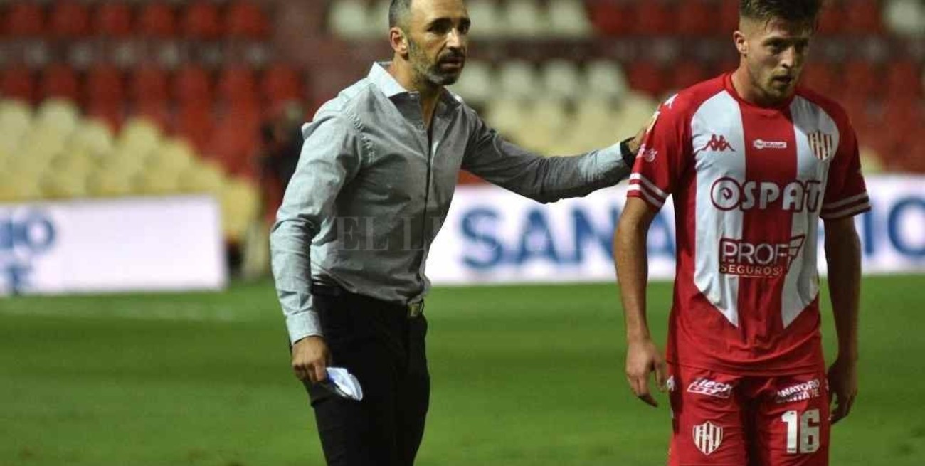 Pablo Aguirre ¡Buena, pibe! , parece decirle Azconzábal a Federico Vera, la figura de Unión y del partido.