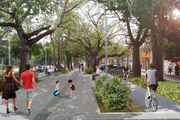 Sobre el cantero central, y a partir de la optimización del espacio de estacionamiento, el proyecto incorpora una bicisenda en sentido norte-sur a lo largo de todo el corredor, como modo de promoción de este medio de movilidad sustentable.