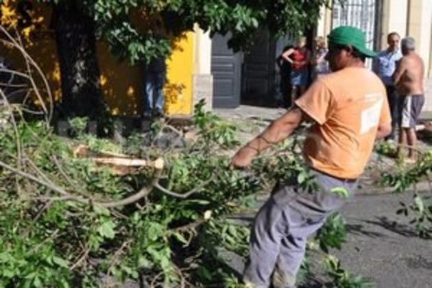Más de 20 cuadrillas de trabajadores municipales, a quienes se sumaron bomberos voluntarios de la zona, trabajan desde poco después de las 14 horas para atender los reclamos en diferentes sectores de la ciudad, que se vio afectada cerca de las 13 por un violento temporal de viento y lluvia que arrasó con árboles y postes, provocó el corte de cables y ocasionó la voladura de techos.