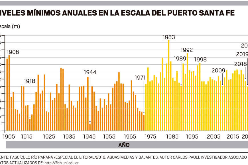 —Sí, pero hay que recordar que en 1970 el mínimo fue 0,20 metros; en 1971 fue 0,42 m.; luego de estas bajantes, la más baja es la actual (1,23 mts al martes). En los últimos 50 años, en 22 años hubo mínimos de menos de 2 m. Pero el promedio de registros mínimos en los últimos 50 años es de 2,20 m.