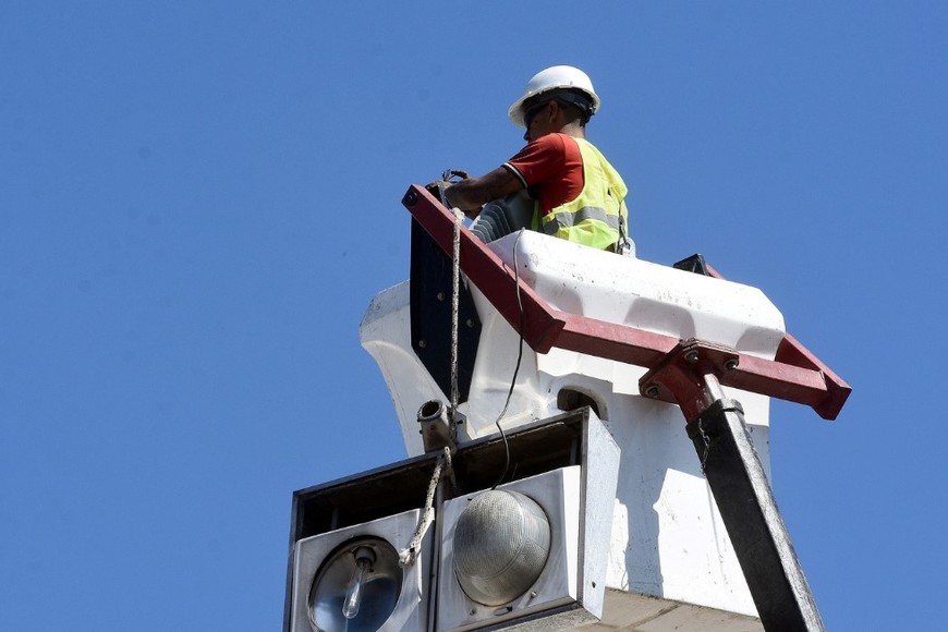Durante esta semana se terminan de colocar las luminarias led en Avenida Perón. Crédito: Guillermo Di Salvatore