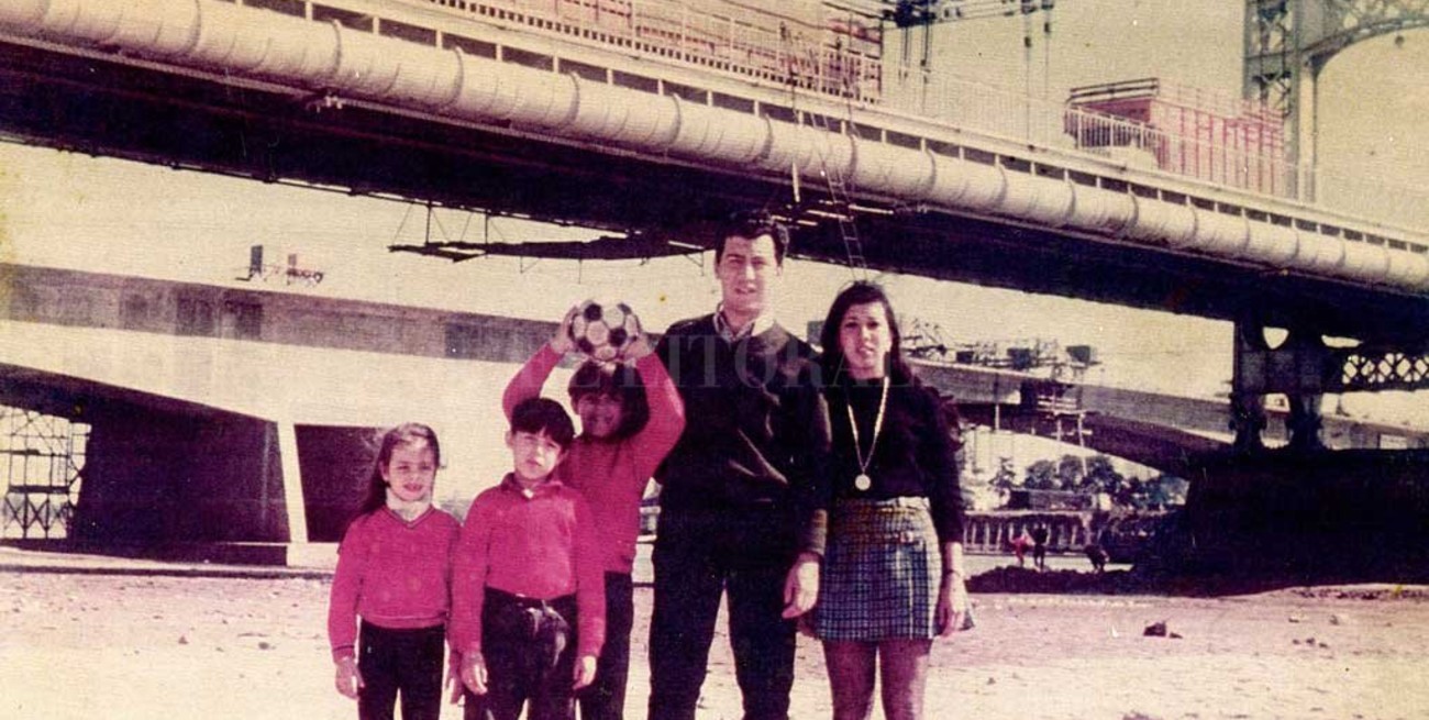 La foto de la familia Puigjane, que se tomó en agosto de 1970 y quedó en el archivo de El Litoral, revela la escala que tenían las bajantes en la cuenca del Paraná hace más de cuarenta años. Hay muchas cosas que llaman la atención: la prolijidad de los chicos —todos con la camisa adentro y remera roja—, la construcción del Viaducto Oroño de fondo y el denso tráfico de camiones sobre las “maderitas” del viejo Puente Colgante. Pero si el foco son las sequías históricas, lo que sorprende es que llevaron la pelota y que la señora caminó con botas de cuero debajo del símbolo de la ciudad.
