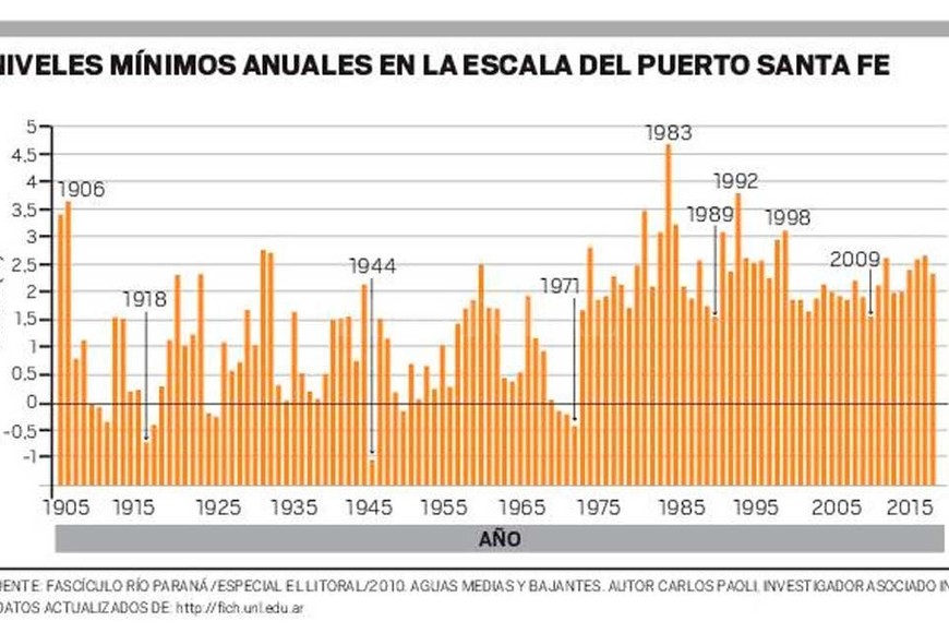 Los datos los recopiló Carlos Paoli, investigador asociado del Instituto Nacional del Agua (y ex director del Centro Regional Litoral del INA). “Ese ciclo de sequía, fue el último período de aguas bien bajas en la cuenca. La construcción de las represas en Brasil, que tienen un efecto moderador, modificó las alturas mínimas del río en el Puerto de Santa Fe, que pasaron a oscilar entre los 1,50 y 2 metros en los últimas décadas”, le explicó a El Litoral.