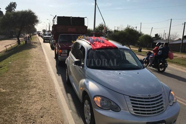 La caravana superó la veintena de vehículos y fue liderada por un coche fúnebre ataviado con grullas de colores papales que llevaba dentro un féretro con la reducción de los restos del cura. Lo secundó una camioneta desde la cual, por parlantes, una voz iba rezando y recordando el paso del sacerdote por los diferentes espacios en una mezcla de procesión con segundas honras fúnebres.