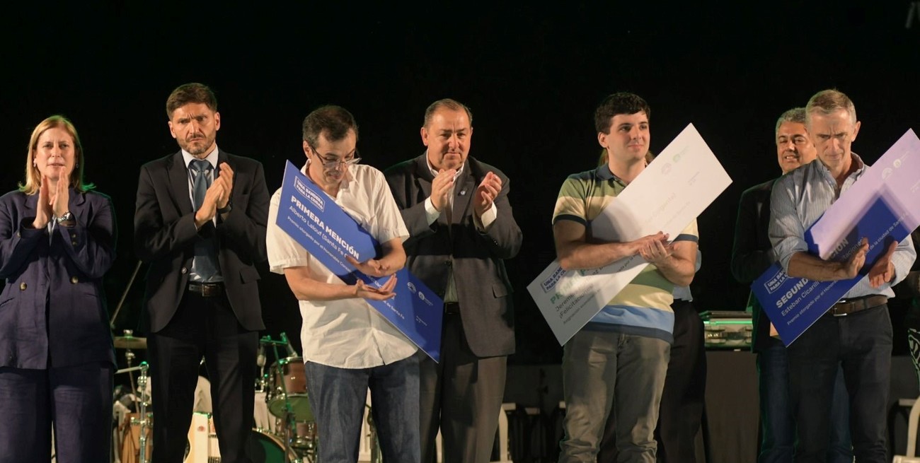 El gobernador Maximiliano Pullaro y el intendente Juan Pablo Poletti, junto al ganador del concurso de la bandera para la ciudad (en el centro) y a los otros dos finalistas. Manuel Fabatía
