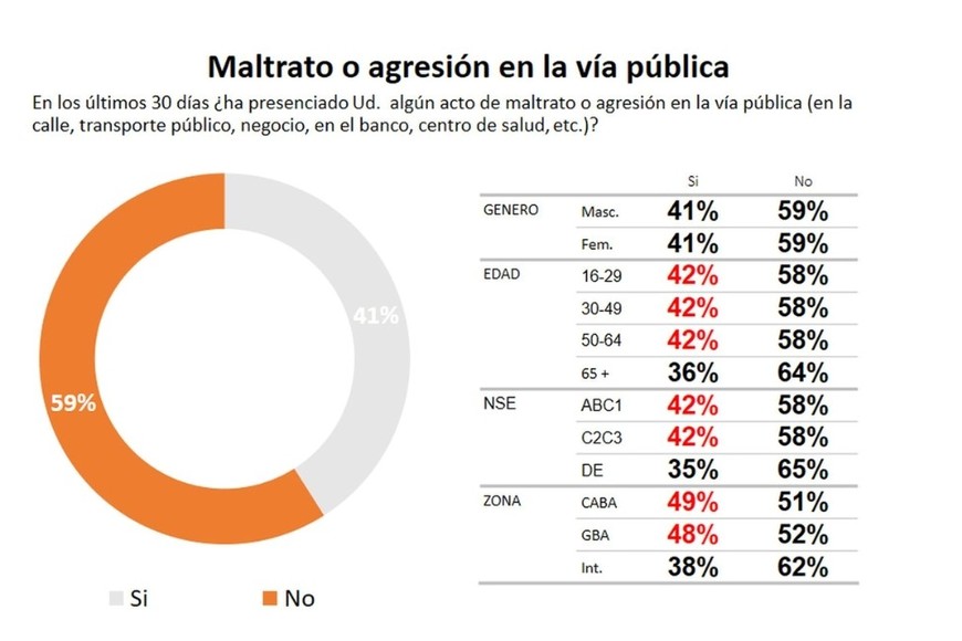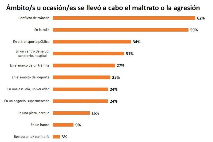 El 41% de los encuestados dijo haber sido testigo de actos de maltrato o agresión en el espacio público en los últimos 30 días. Un 62% de los conflictos ocurren en el tránsito, 59% en la calle y 34% en el transporte público. La incidencia es menor en el interior del país que en Buenos Aires.