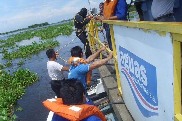 Tres buzos tácticos de una empresa rosarina, con el apoyo de técnicos y una embarcación de Aguas Santafesinas, trabajaban este lunes a la mañana para despejar de camalotes la toma de agua en el Riacho Santa Fe.