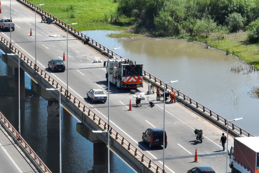 Este viernes, Vialidad Provincial realizaba tareas de mantenimiento sobre el puente del río Salado que cruza la autopista. Foto: Fernando Nicola
