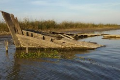 Entre los escombros y los rústicos durmientes de quebracho que asoman a la superficie como lanzas, los que otrora fueran muelles del antiguo puerto, se recuesta un esqueleto todavía identificable como barco, de madera y hierro oxidado. La postal remite a la portada del libro del periodista, escritor y navegante español Arturo Pérez Reverte cuyo título se ancla en esta historia: Los barcos se pierden en tierra.