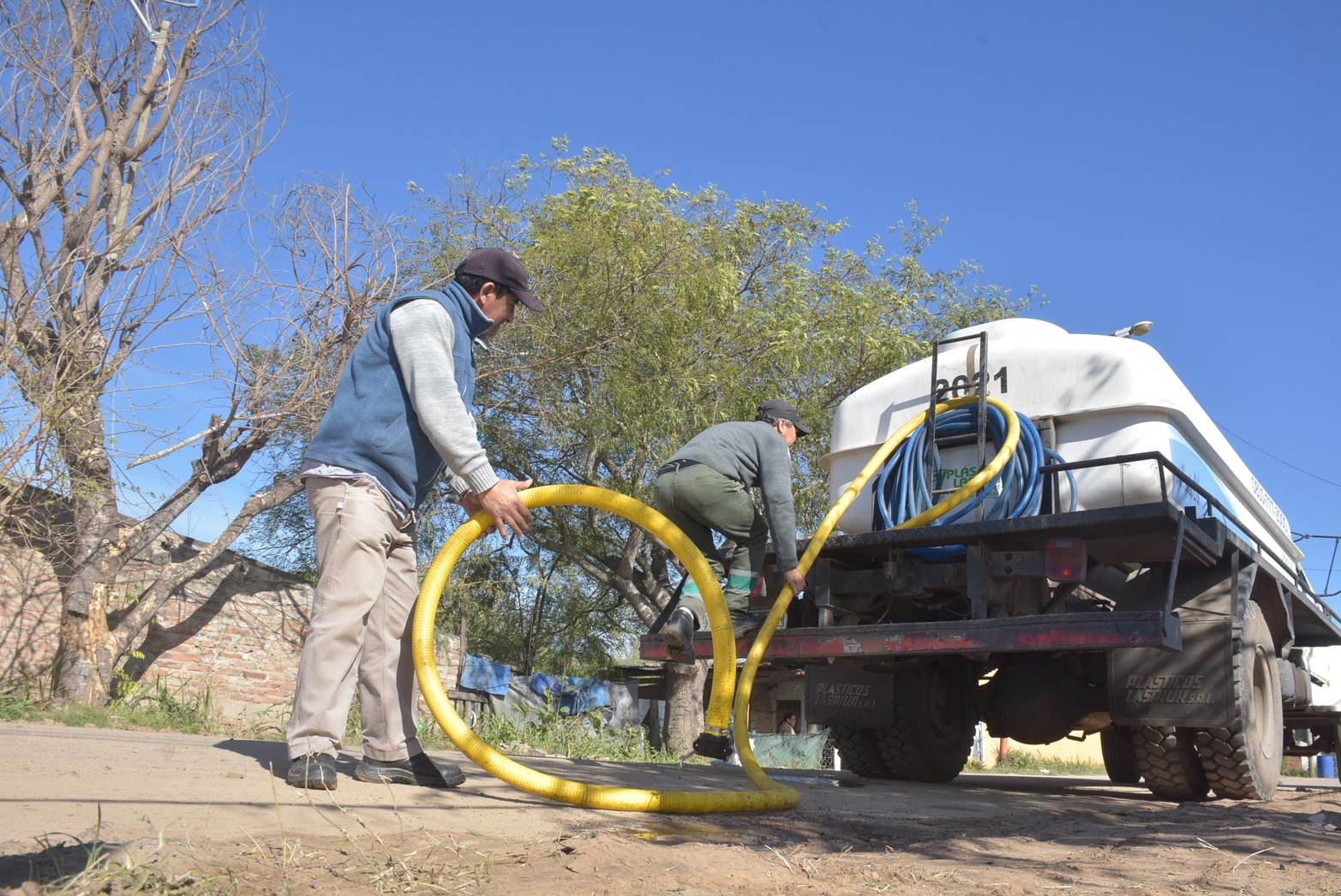 8 / 10 En la calle de ingreso a Colastiné Sur ya empiezan a aflorar unos objetos que serían extraños al paisaje de cualquier otro barrio: tanques de cemento o de plástico y enormes bidones azules, ocupan los frentes de las viviendas, en lugar del habitual adorno de plantas y maceteros. Es que el acceso a estos recipientes desde la calle es clave: tres días a la semana pasa el "camión aguatero" a llenarlos del elemental líquido.Foto Flavio Raina