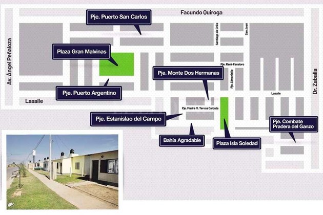 Ahora, los pasajes que serán bautizados se encuentran en el sector comprendido entre Facundo Quiroga al norte, Av. Peñaloza al oeste, calle innominada (205.50 según código catastral) al sur; y calle Dr. Zavalla al este. Los nombres aluden a la guerra de Malvinas, como homenaje a los héroes caídos.