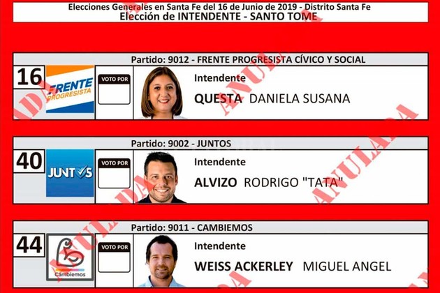 En la categoría Intendente aparecen la actual mandataria Daniela Qüesta (FPCyS); Rodrigo “Tata” Alvizo (Unidad Ciudadana), concejal del Frente Juntos, y Miguel Weiss Ackerley (Cambiemos Santo Tomé).