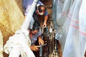 Calle Suipacha. El cable subterráneo recibe una reparación, en 2000. La ciudad debió sufrir la crisis eléctrica de 1994 para que por fin se cerrara su anillo de distribución y cada sector contara con una doble alimentación. Foto: Archivo El Litoral