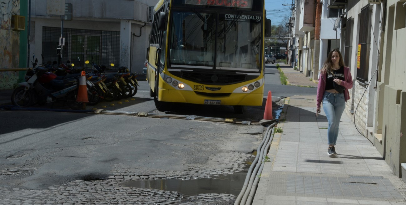 Calle Irigoyen Freyre entre San Luis y Rivadavia. Pleno macrocentro de la ciudad de Santa Fe. Caño atraviesa la calle de vereda a vereda. Asfalto roto. Baches. Falta de pavimento. Adoquines. Ondulaciones. Precaución al transitar. ¿Qué es todo esto?