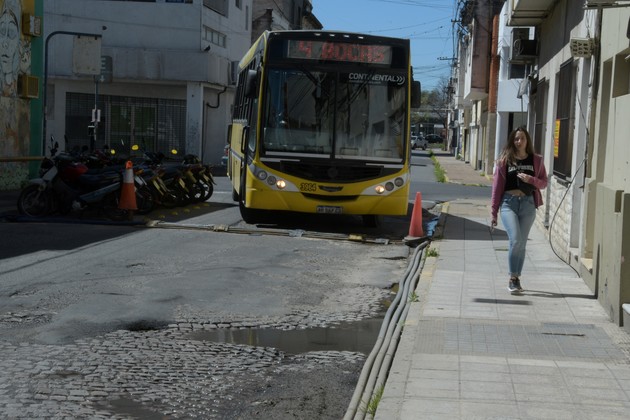 Colectivos, transportes de carga, transporte público por colectivos, taxis, remises, autos de aplicaciones, autos particulares, motos y bicis. Peatones que saltan charcos y cruzan la calle. Mucho tráfico sobre calle Irigoyen Freyre. Gente que viaja hacia el centro, a la Peatonal. Gente apurada, que se queja al atravesar esta arteria en muy mal estado. Sobre todo en los horarios pico de tránsito, cuando todos quieren llegar rápido y circular por esa zona de la ciudad se torna un caos.