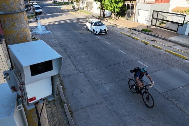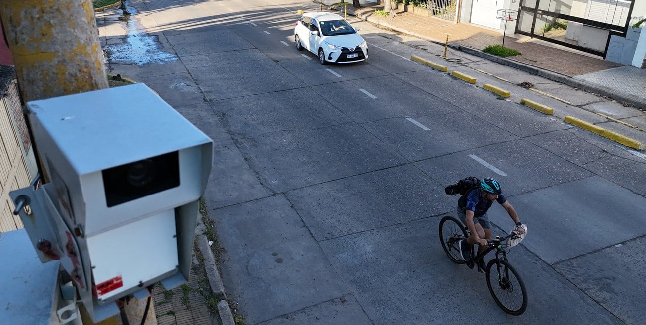 La señal que indica que la velocidad está controlada por radar, en una esquina de Marcial Candioti. Crédito: Luis Cetraro