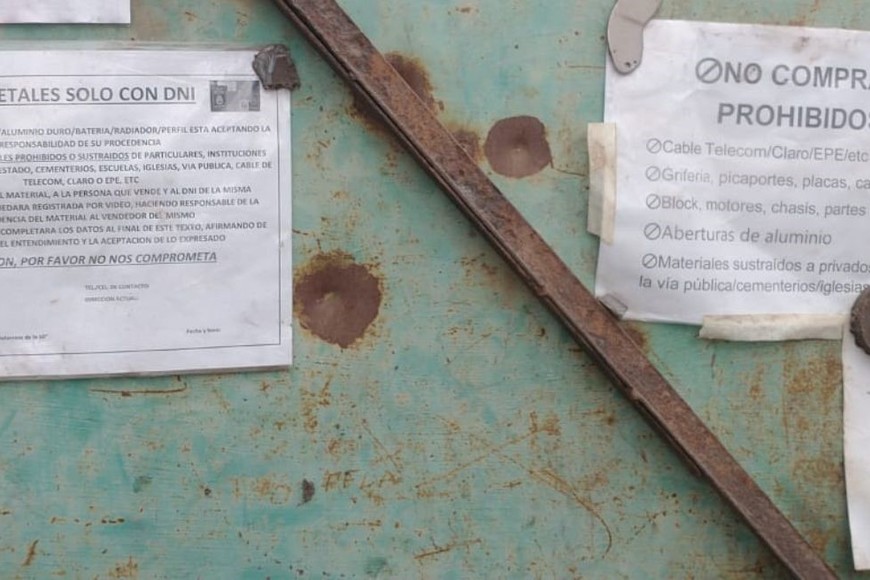 “No compramos prohibidos”, dice en mayúsculas un cartel en la entrada de una chacarita de la ciudad de Santa Fe. Más abajo, aclara cuáles son los productos que usualmente son robados con el fin de cambiarlos por alguna moneda en las chatarrerías.