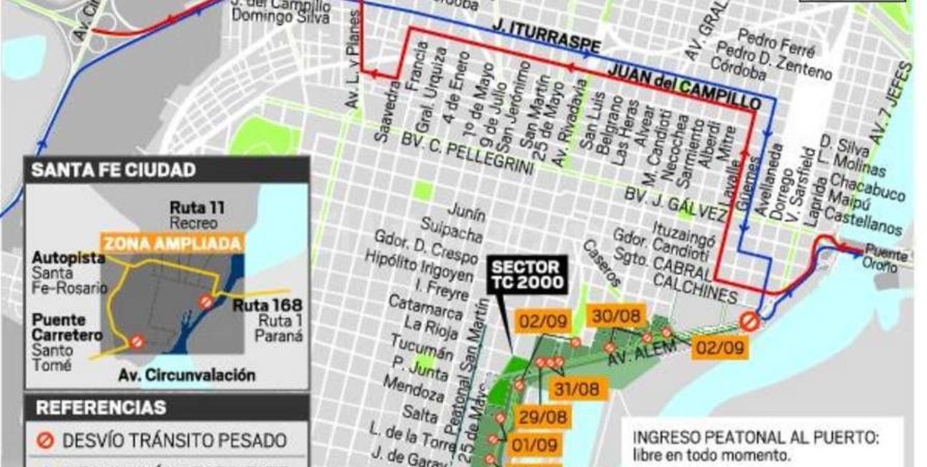 Por su parte, el 1º de septiembre desde las 8 de la mañana se cerrará calle Salta en su intersección con 27 de Febrero y, desde las 14, se hará lo propio en Mendoza, en su intersección con 27 de Febrero al oeste. Finalmente, el viernes 2 desde las 14 se cerrarán las cabeceras de pista: 27 de Febrero y Lisandro de la Torre, además de la denominada “Curva de la Cervecería” de avenida Alem y Alberdi. (ver desvíos de tránsito pesado en la infografía)