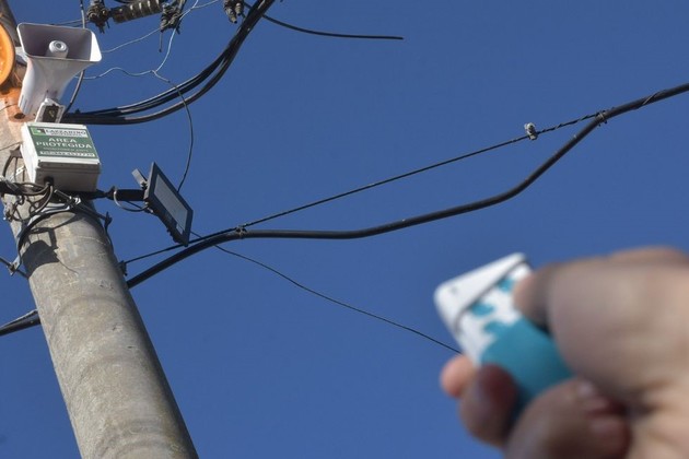 La alarma cuenta con una función que enciende el reflector; otra que activa la sirena; y una que prende la luz, suena y da aviso al centro de monitoreo municipal. Crédito: Flavio Raina