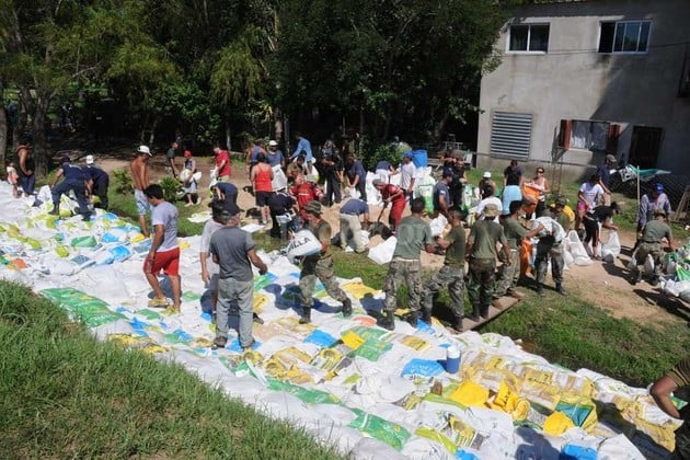 Durante la madrugada se registró una filtración en la defensa detrás del ex camping municipal. Bomberos voluntarios y Zapadores, Ejército, Defensa Civil y vecinos colaboran colocando bolsas de arena.