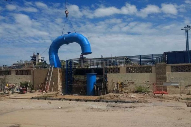 La pieza colocada en la jornada de este miércoles consiste en una “u” invertida compuesta de dos tramos que se instaló sobre la acometida vertical de ingreso a la planta de la nueva cañería de un metro de diámetro y que va a estar soportada por dos torres de hierro fundadas en bases de hormigón armado.