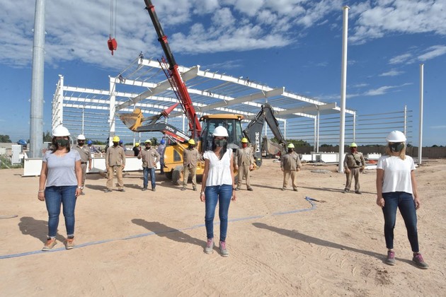 Un jueves a la mañana, con el sol aún piadoso y el viento que atenúa la temperatura de enero, el predio ubicado en Mons. Rodríguez casi llegando a la ruta 11 es un mar de cascos de diferentes colores. Y la ambientación se va construyendo con el ruido de máquinas de gran porte, golpes de herramientas e indicaciones a viva voz.