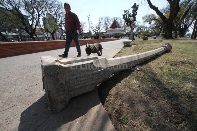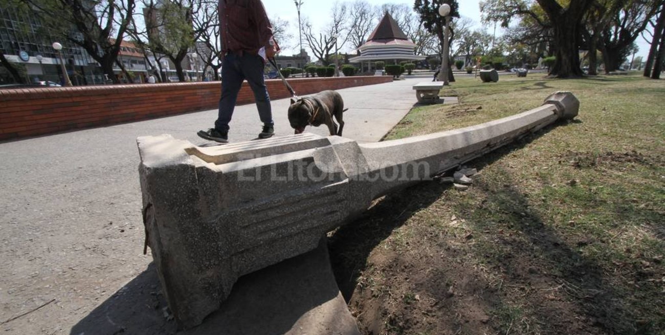 Hay una de estas farolas que está tumbada en el piso, muy deteriorada. Hay varias más que ya no tienen “la bola” del chupetín y no iluminan nada. A este cuadro hay que sumar algunas baldosas rotas y otra paradoja que se da en muchas plazas de la ciudad: los mástiles no tienen banderas, en este caso en la plazoleta que está en frente, yendo hacia Belgrano.