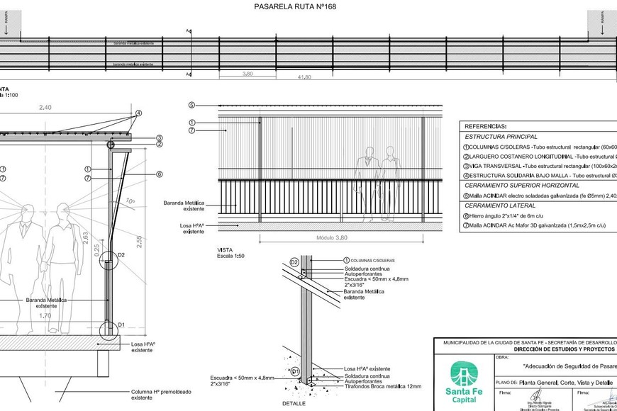 “La obra consiste en la ejecución de los trabajos completos de herrería previstos para el montaje del cerramiento integral superior y lateral en la pasarela peatonal existente ubicada sobre la Ruta Nacional Nº 168, a la altura de la Ciudad Universitaria de la UNL”, describen los pliegos.