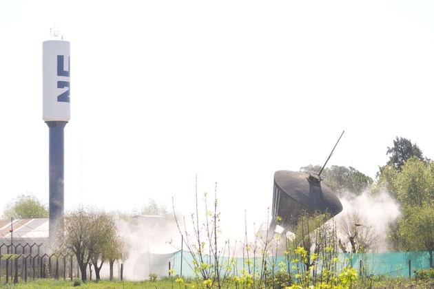 En el piso se sintió un cimbronazo pero no se levantó una enorme cortina de polvo, de ésas que se ven en otras demoliciones de mayor escala. Ocurrió que el Ejército realizó una demolición controlada del tanque mediante un explosivo especial, que se utiliza mucho en minería y ruptura de formaciones rocosas. Es que la torre medía casi 40 metros, y por su altura debía colapsar verticalmente, no caer hacia un costado.