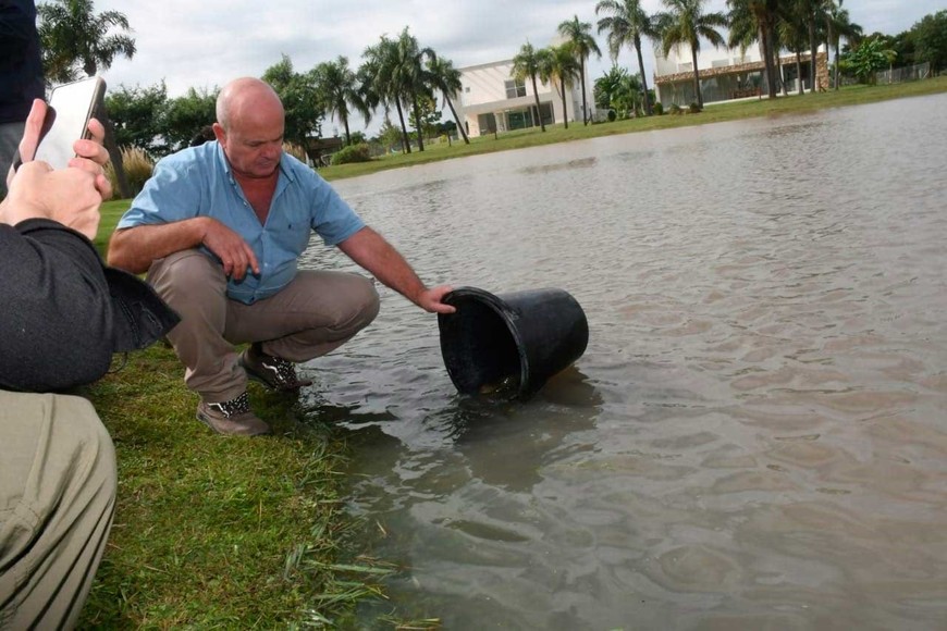 A partir de la inquietud de los habitantes del country, investigadores de INTA y CONICET realizaron primero una inspección ocular y análisis de muestras del agua de las lagunas del barrio para determinar la densidad de siembra a realizar. Y este jueves finalmente la concretaron.