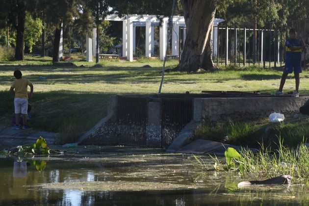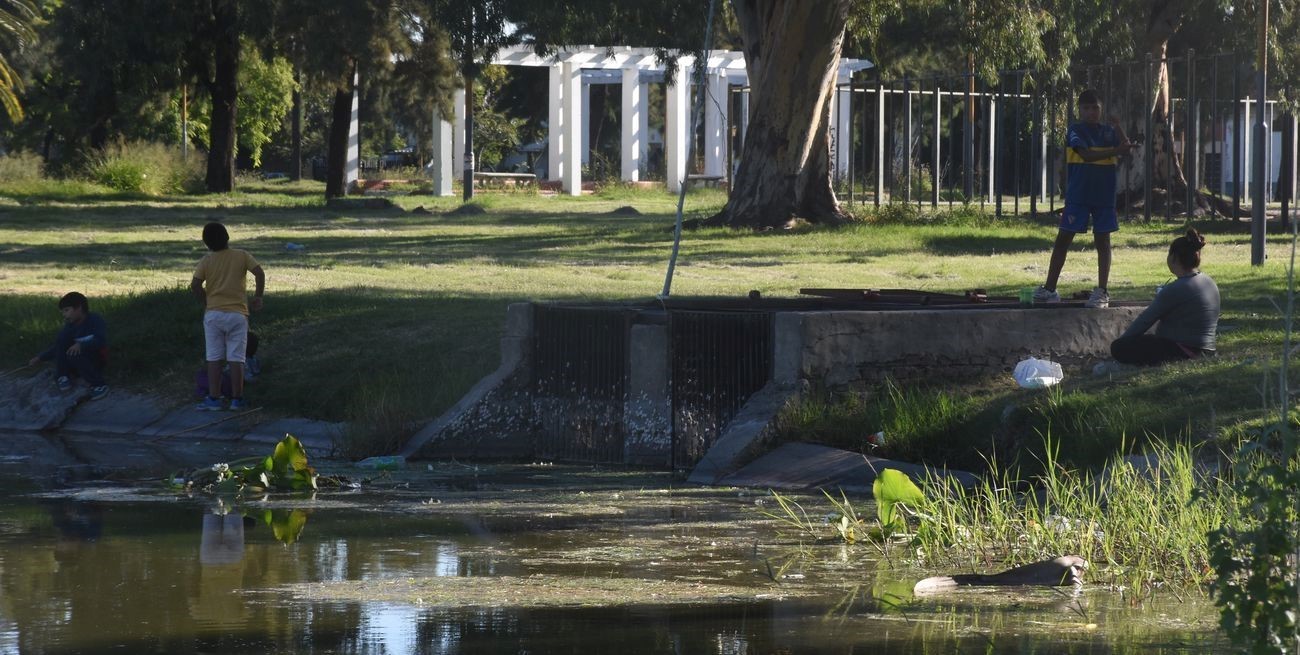 La imagen del abandono en el lago del Parque Garay, con la gente al borde del mismo. Es un foco de múltiples infecciones.