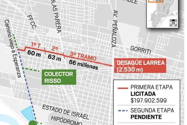 La primera etapa de la obra se licitó el 12 de mayo, con un presupuesto de 197.902.599 pesos. Son 2.530 metros de un desagüe que comienza en Larrea y llega hasta la intersección con el Camino Viejo a Esperanza. El lote 1 comienza allí y va hasta las vías del ferrocarril y el lote 2 llega hasta la avenida Blas Parera (ver infografía).