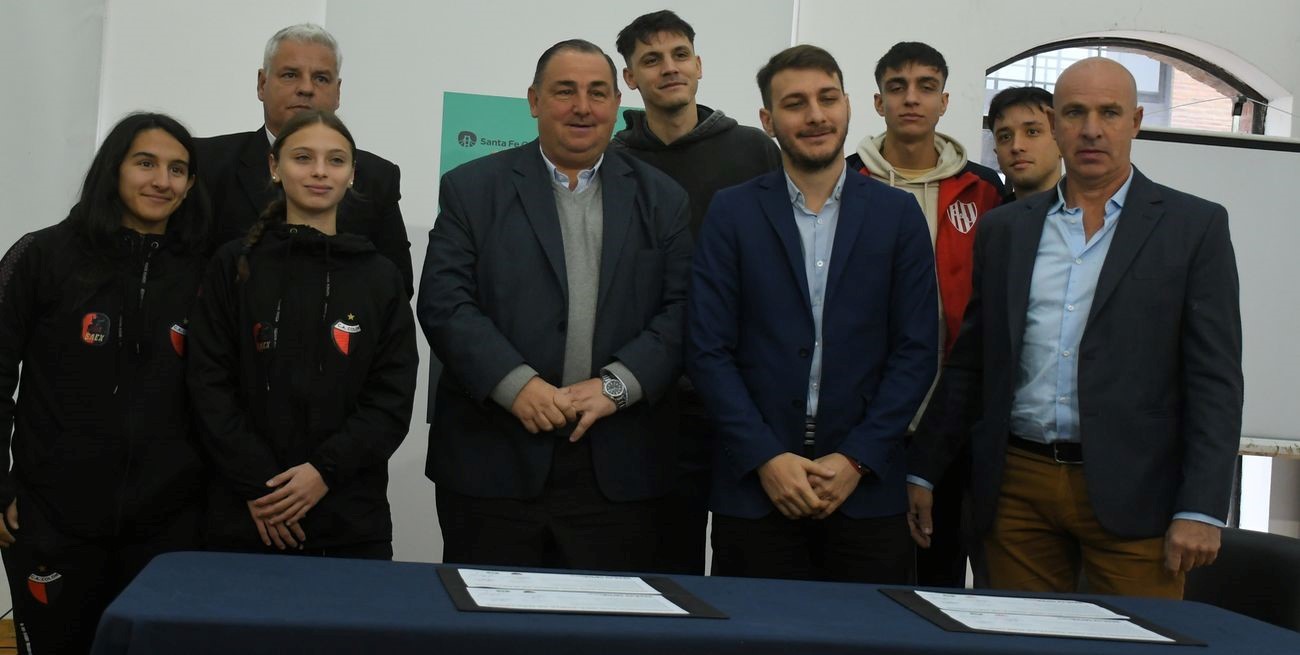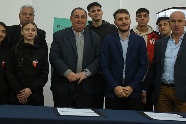 En la firma del compromiso estuvieron presentes representantes del municipio, dirigentes, jugadoras y jugadores de Colón y Unión. Foto: Guillermo Di Salvatore