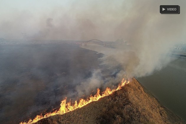 Desde el aire: quema de pastizales a metros del Puente Carretero