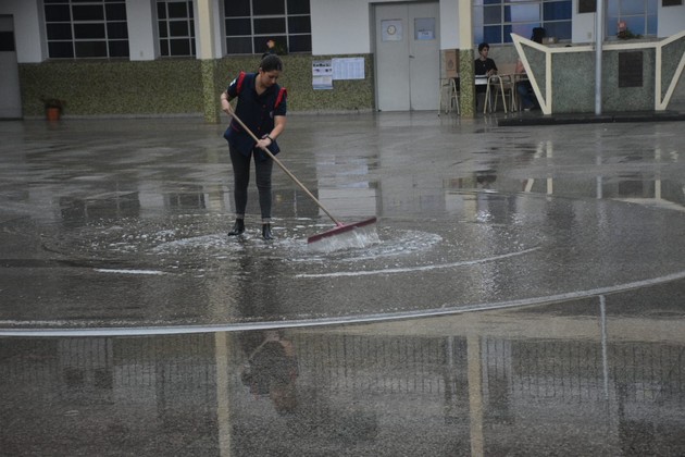 A media mañana los principales inconvenientes ya habían sido subsanados y el personal de la escuela se encontraba trabajando en la tarea de limpieza; básicamente escurrir y secar.