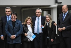 La llegada de Fernández, estuvo acompañada por Agustín Rossi, jefe de gabinete y precandidato a vicepresidente y la del gobernador santafesino, Omar Perotti.