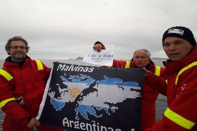 Gentileza Nilo Navas Orgullo. El ex combatiente Nilo Navas hace flamear, cada vez que llega a tierra, la enseña que expresa: Malvinas-Argentina .