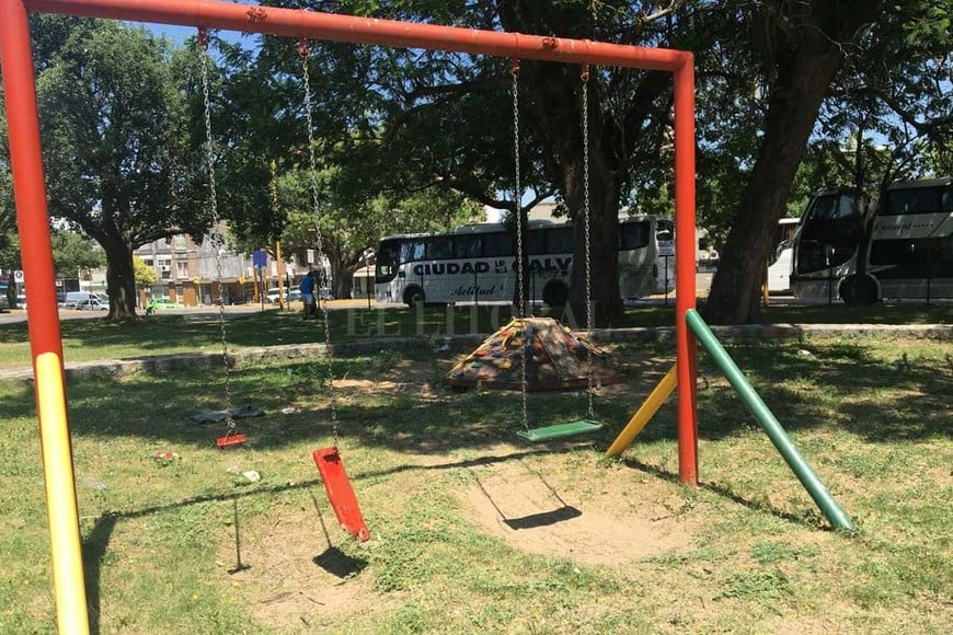 Los dos sectores de juegos infantiles -ubicados en ambas cabeceras del parque- merecen una mención aparte. Les falta pintura, hay hamacas rotas y las paredes bajas que circundan el área tienen faltantes de adoquines, con huecos que son un peligro potencial para los pequeños usuarios. Pero esto no es todo: montañas de basura y césped crecido se acumulan al lado de donde los niños deberían jugar.