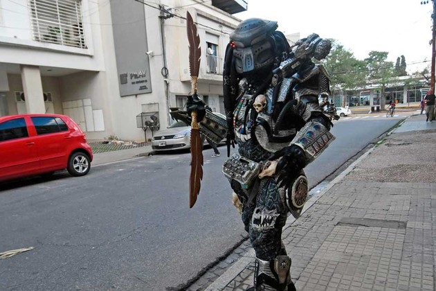 -Flaco, disculpá, ¿nos podemos sacar una foto con vos?-, interrumpe la escena una señora. Su marido ya tenía listo el celular. Eran las cinco de la tarde, de una tarde húmeda y pegajosa. ¿Qué era todo aquello que parecía salido de un cuento bizarro? Era un joven que de tan fanático de una película -"Depredador", 1987- se "mimetizó" con uno de sus personajes y diseñó el disfraz: una entidad alienígena con poderes tecnológicamente avanzados cuya meta es "cazar" trofeos humanos.