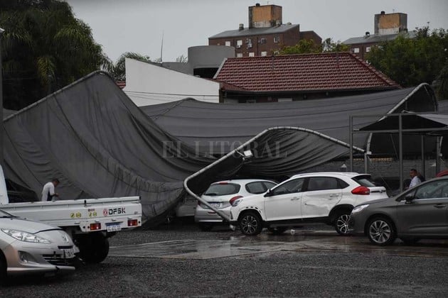 Precisamente, los fuertes vientos provocaron daños en una concesionaria de autos ubicada en la zona de Belgrano y Alem. Las ráfagas tumbaron una estructura de caños y media sombra de una playa donde se guardaban autos.