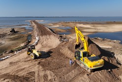 Durante los últimos meses, y con un nivel de la laguna que da tregua para efectuar los trabajos, se volvieron a preparar los terraplenes en las costas de El Chaquito y San José del Rincón desde donde se unirán los 1.850 metros que los separan. La cañería que se debe cruzar ya está desplegada sobre el camino que se formó en la zona de defensas de Rincón, atravesará la laguna a unos 25 metros de profundidad.