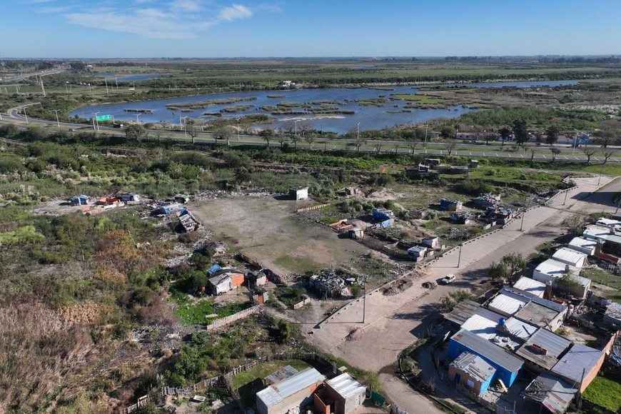 A un lado y al otro de la autopista hay dos grandes reservorios. El agua de lluvia que cae en parte de la ciudad escurre hacia ellos y descarga en el Salado. Antes de la pandemia no estaban ocupados. Crédito: Fernando Nicola