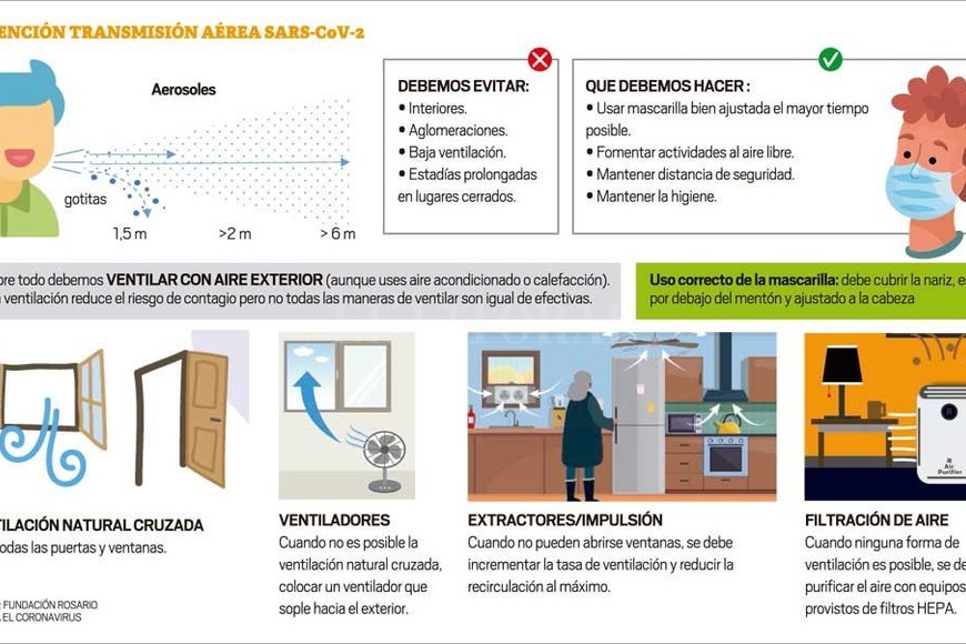 Todas estas son recomendaciones muy importantes. Ninguna intervención aislada es perfecta para prevenir la transmisión del SARS-CoV-2. Todas deben seguir teniéndose en cuenta y cumplirse para aumentar las probabilidades de éxito: ventilar de forma cruzada y permanente los ambientes cerrados es clave, el distanciamiento social de al menos 1,5 a 2 metros de distancia, el uso correcto del barbijo, fomentar actividades al aire libre y la higiene de manos y superficies.