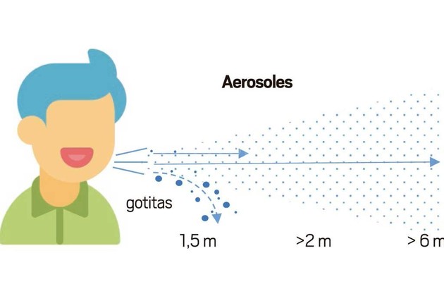 Debieron pasar muchos meses hasta conocer información científica contundente sobre una tercera vía de transmisión, también aérea, y mucho más potente en términos de transmisibilidad del virus: los aerosoles, microgotículas de un diámetro muy inferior a las macrogotas, que se expelen por nariz y boca y que, además, pueden quedar mucho tiempo suspendidas en el aire de un ambiente cerrado.