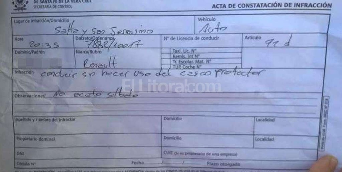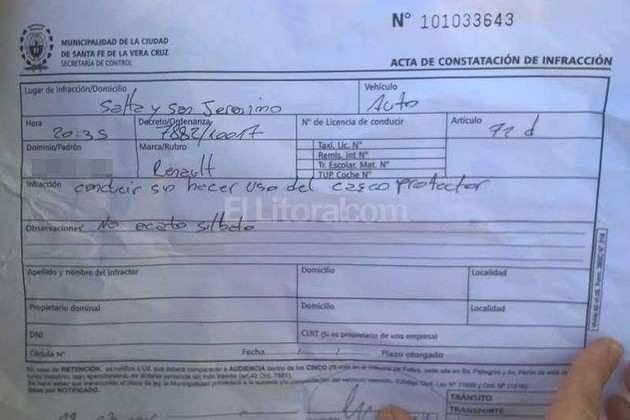 Una lectora de El Litoral envió a nuestro WhatsApp una foto de una multa que un inspector municipal le labró por cometer la siguiente infracción: “conducir sin hacer uso del casco protector”.