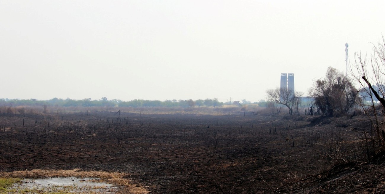 Las llamas del último incendio en la isla Santa Cándida estuvieron a pocos metros de la cabecera santafesina del túnel. Foto: Paola Peltzer