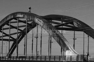 Una vez en el punto más alto del arco, el joven se sube a su bicicleta BMX y se lanza a rodar hacia abajo a toda velocidad. Al llegar al suelo el joven se cae y su bicicleta rueda hasta el carril contrario del sentido en el que se arrojó y provoca un accidente con un camión que circula por el puente hacia Santo Tomé. El camión frena y arrolla la bicicleta, por fortuna sin su ocupante.