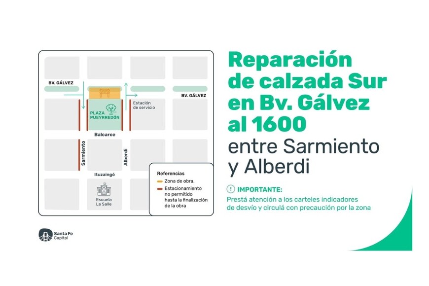 Quienes circulen de oeste-este sobre Bv. Gálvez se deberán desviar por: Sarmiento – Ituzaingó – Alberdi – Vuelta a Bv. Gálvez. Además, sobre calle Sarmiento desde Bv. Gálvez hasta Ituzaingó; y Alberdi, entre Balcarce y Bv. Gálvez, el estacionamiento no estará permitido hasta la finalización de la obra para mayor fluidez vehicular.