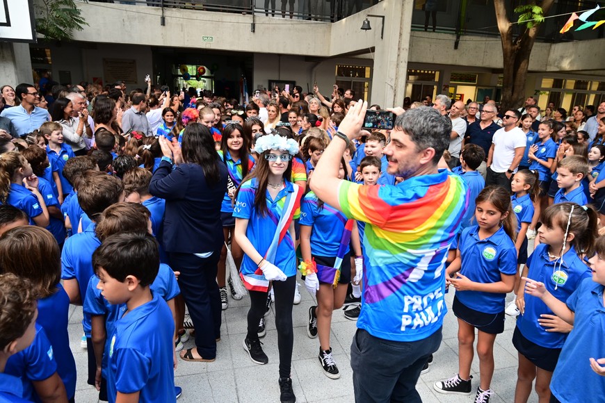 A los costados estaban los docentes y directivos, mientras que en el frente sobresalía una pizarra que daba la bienvenida con dibujos del personaje Mafalda, y tenía la frase escrita en colores verde y rojo: “Llenemos la escuela de días felices".