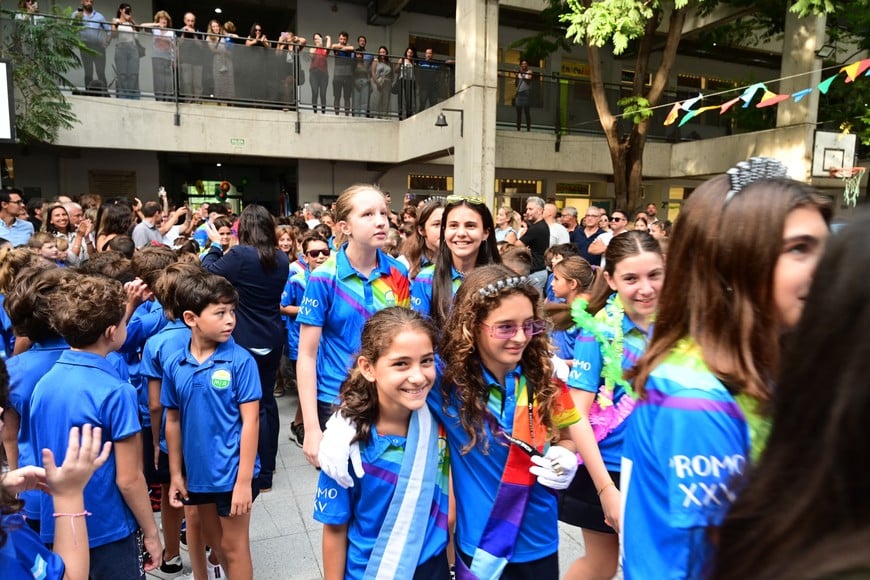 La ceremonia comenzó con la deslumbrante entrada de los futuros egresados, con sus chombas de colores, elementos de cotillón, y una música de carnaval de fondo. Entre aplausos y sonrisas ingresaron últimos para sentarse junto al resto de los grados del nivel primario y los pequeños del nivel inicial, ya dispuestos en el patio.